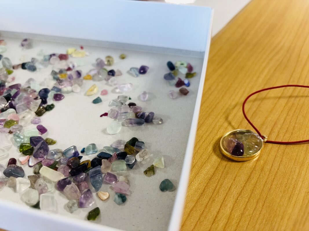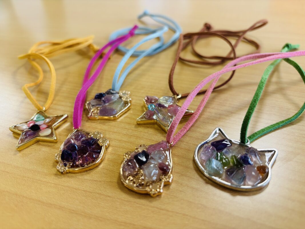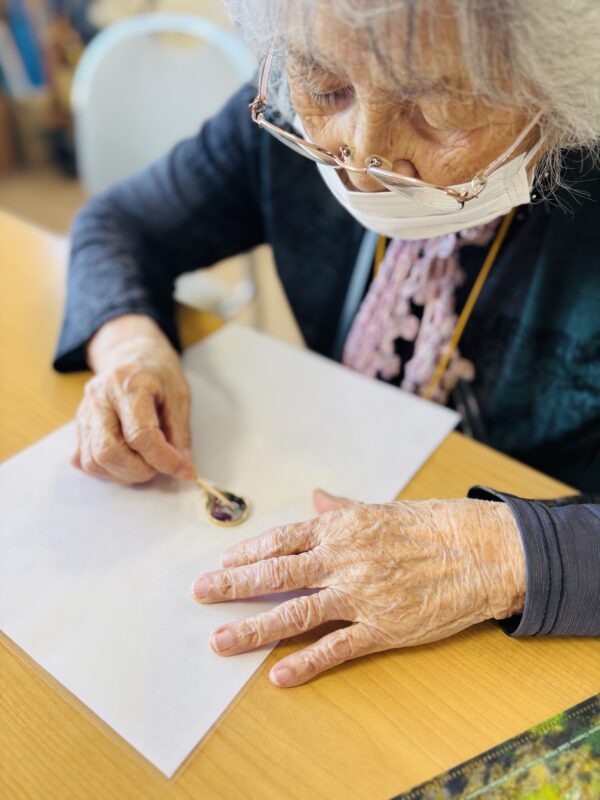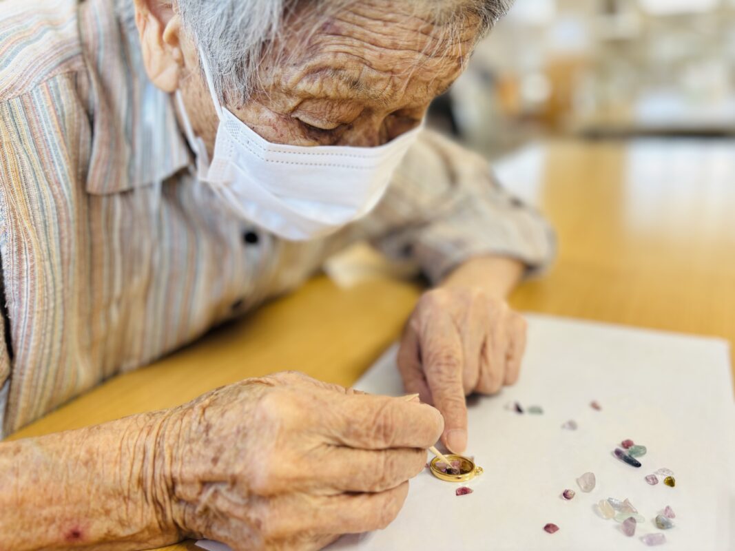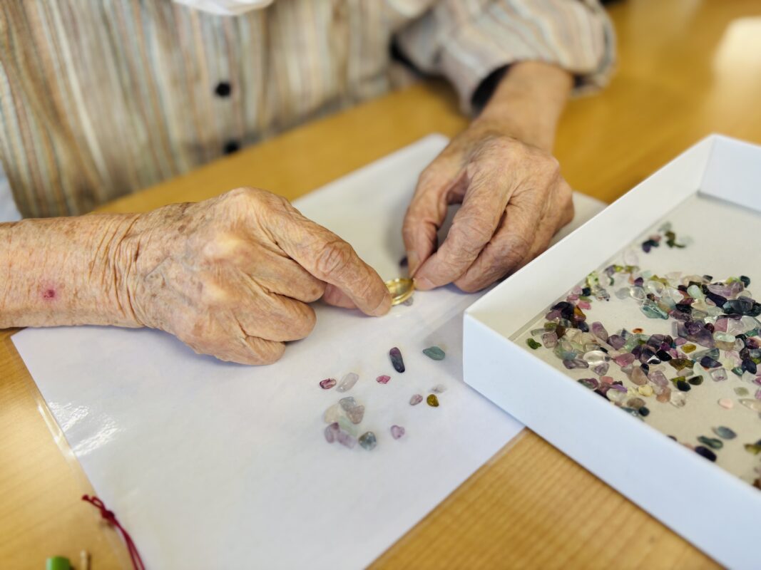 2025.09.25 9月のお楽しみ手芸 今月はアクセサリー作りを楽しみました。 お好きな色のシーグラスを集めて、レジンで固めて仕上げると、とても素敵な作品に! 細かい作業でしたが、みなさん真剣に取り組まれ、完成した時には笑顔が溢れていました。