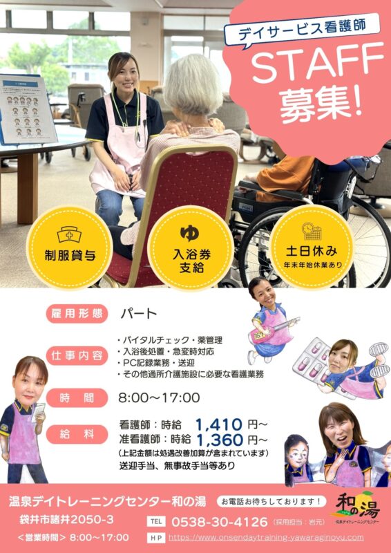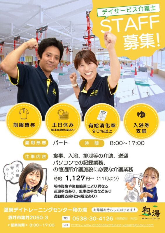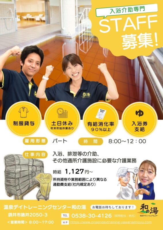 温泉デイトレーニングセンター和の湯では、一緒にお仕事をしてくださる仲間を募集しております!